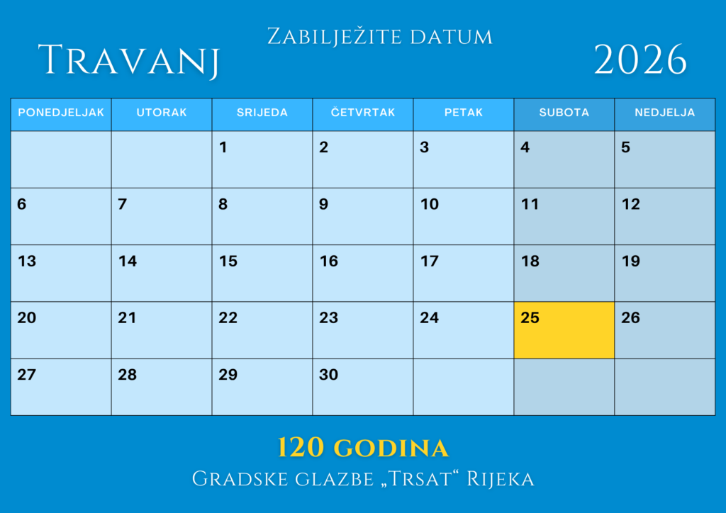 Opis: Povodom 120. obljetnice djelovanja, Gradska glazba „Trsat“ Rijeka organizira svečani obljetnički koncert kojim želi dostojno obilježiti ovu veliku obljetnicu i okupiti publiku, prijatelje orkestra te gostujuće puhačke orkestre u zajedničkoj proslavi. Ulaz na koncert je slobodan.